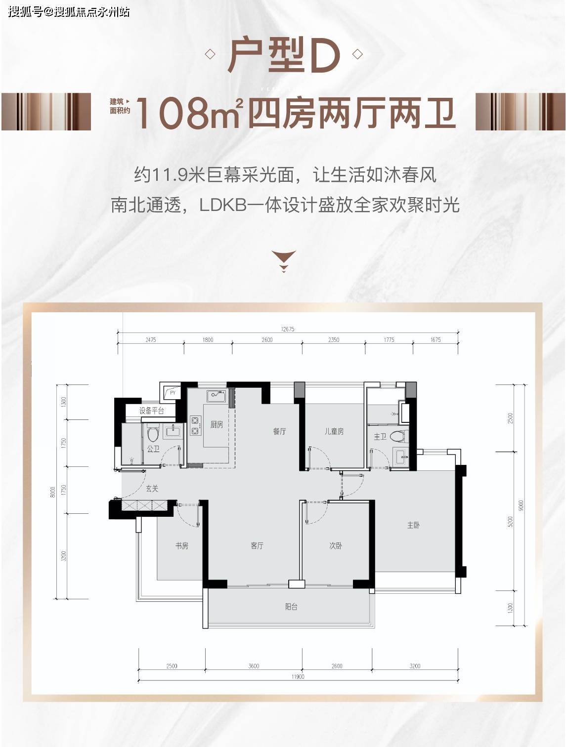 建面约108m²的户型:一步到位购置4房,该户型南北通透,约6.2米观景阳台,除了可以坐在这里晒太阳喝茶,还能放置花草、健身器材……无论是修养身心还是锻炼身体都是不错的选择。