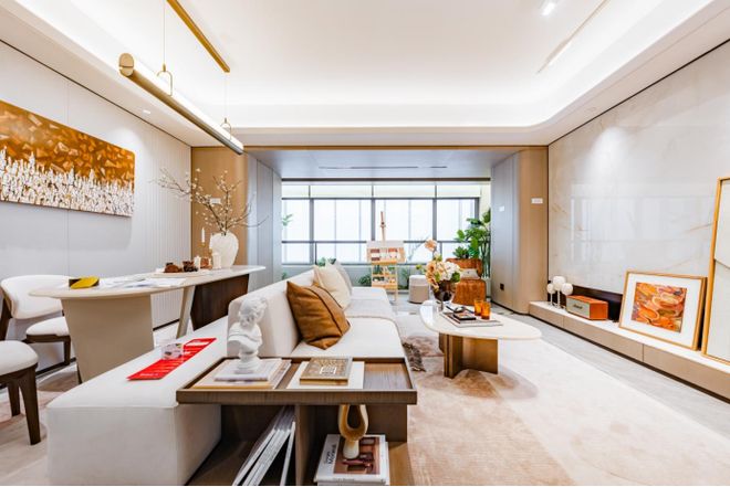 一体化餐客厅中轴生活主场:餐客厅都在同一条中轴线上,连接景观阳台,可以尽情观赏窗外的风景。