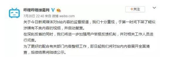 关于今日新闻媒体对B站内容的监督报道,我们十分重视,于第一时间下架了疑似涉嫌有不良内容的视频,并启动复查。